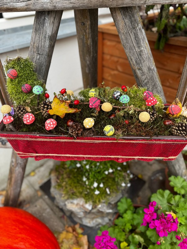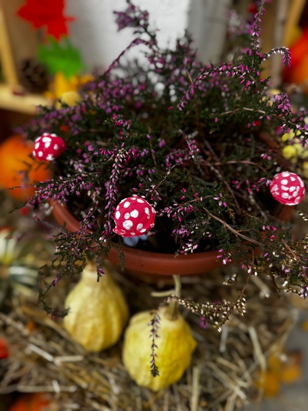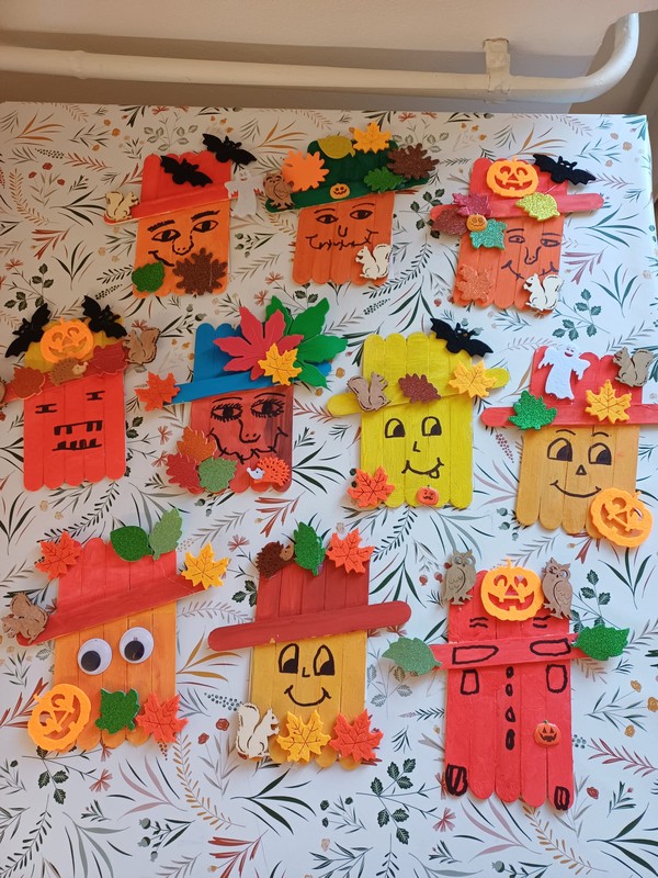 V rámci denního programu jsme se také věnovali nejrůznějším podzimním tématům. Při tvořivých aktivitách vznikaly originální obrazy, obrázky z přírodnin, ale také veselí podzimní strašáci, kteří teď zdobí naše prostory a přinášejí dobrou náladu. Vyráběli jsme hroznové víno z papíru, ježky z vlny, nebo barevné muchomůrky ze sádry. Ty se také staly nedílnou součástí naší podzimní výzdoby, na kterou jsme letos obzvlášť pyšní.